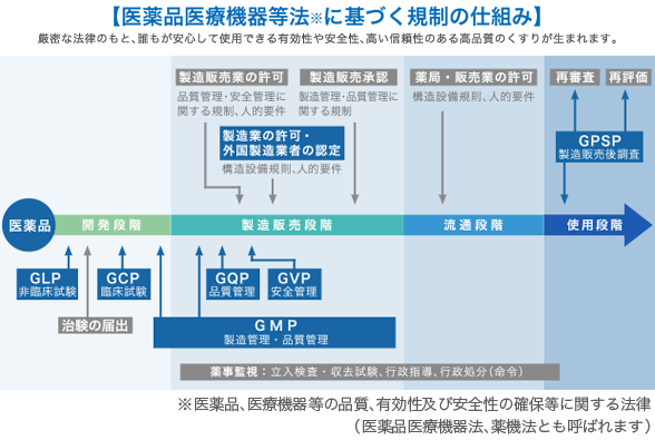 私たちが品質のよい薬を安心して使うことができるように、薬は「医薬品医療機器等法※」により製造から流通、使用されるまでの各過程で厳しい管理基準が定められています。