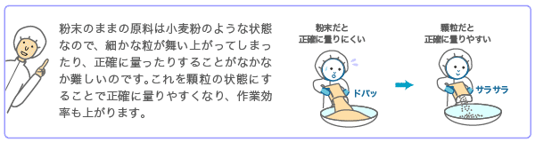 秤量工程で正確に計りとった原料を、1錠・1カプセルごとに均等に配分できるようにするためです。
