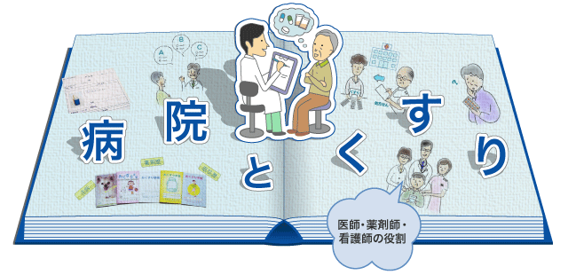 医師は病気を診断し、治療のために適切な薬を処方します。薬剤師は薬を保管・管理し、医師の処方箋(しょほうせん)に従って適切に調剤し、患者さんに薬の説明をします。看護師は、医師の指示のもとに注射をし、また、一人で薬を飲めない人への介助や、副作用の観察などを行っています。医師・薬剤師・看護師がぞれぞれの専門知識を生かし、協力することで、患者さんが安全かつ効果的に薬を使用できるように役割をはたしています。